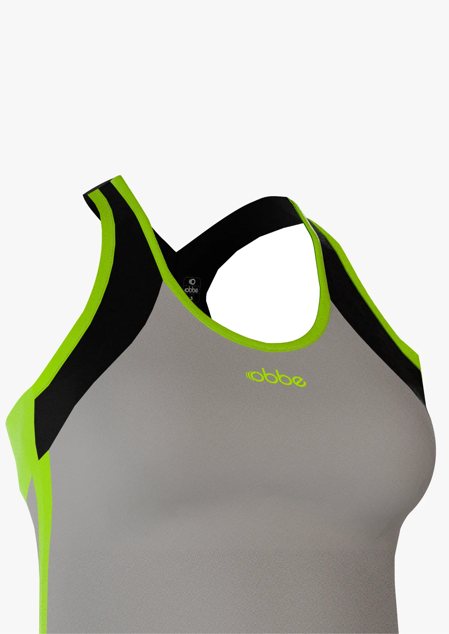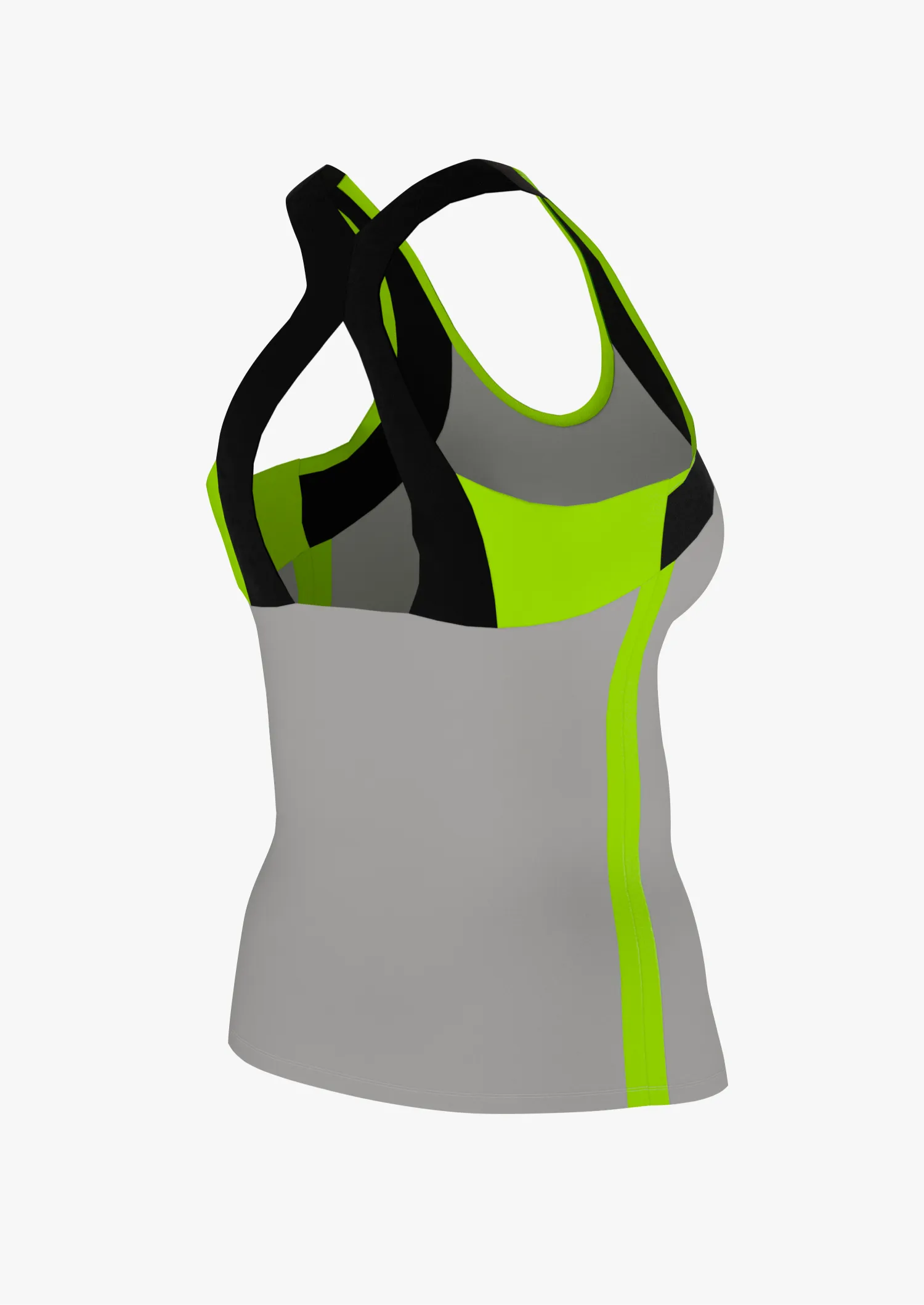 Top de alto rendimiento para mujer color gris-amarillo flúor con detalles en vinyl print.