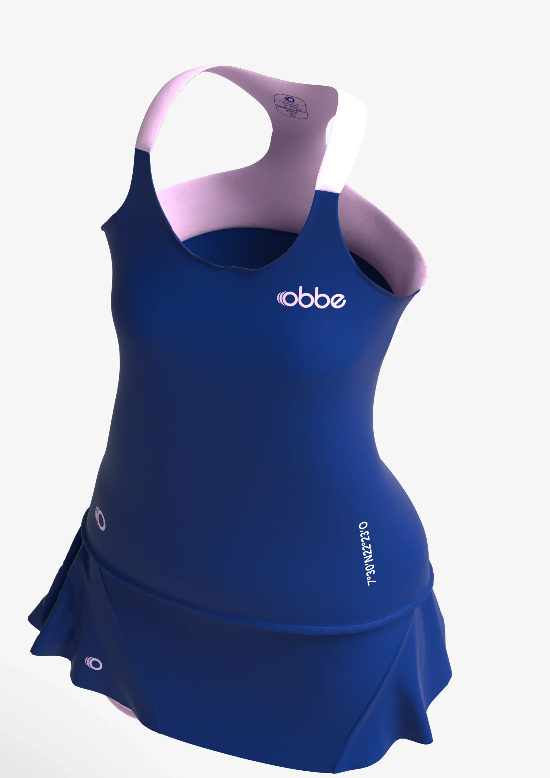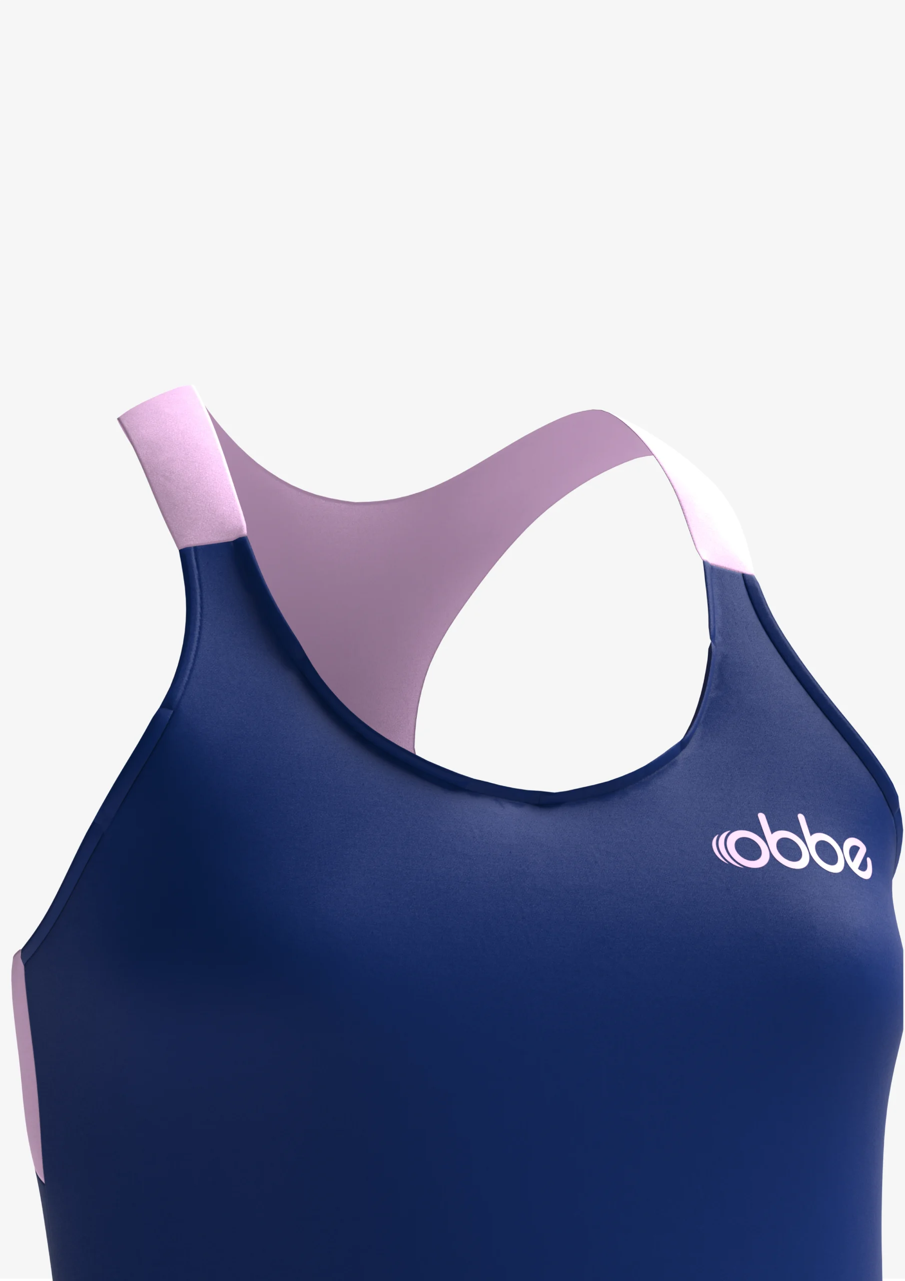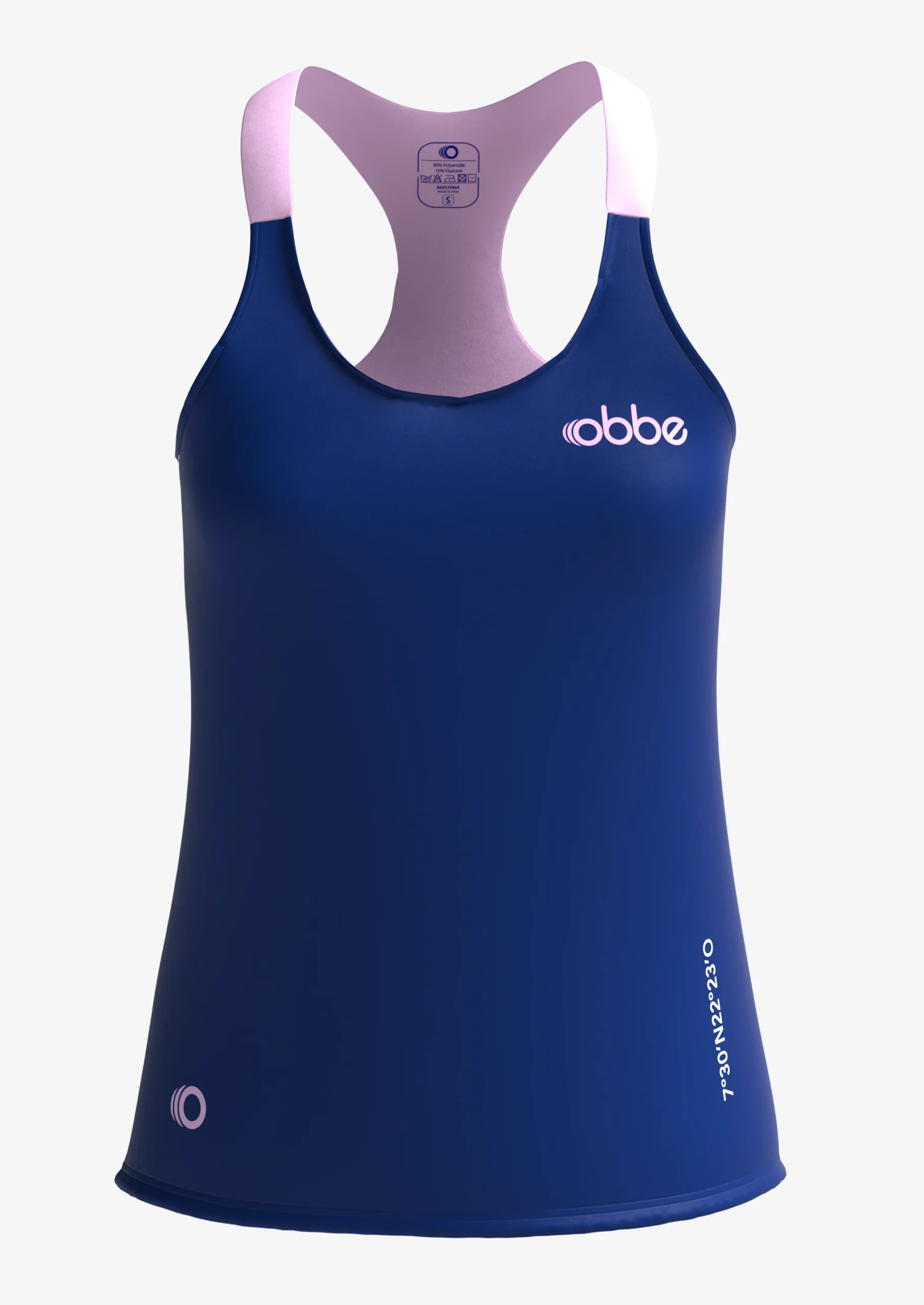 Top de alto rendimiento para mujer color azul marino y rosa con detalles en vinyl print.